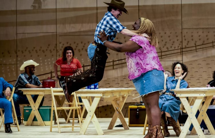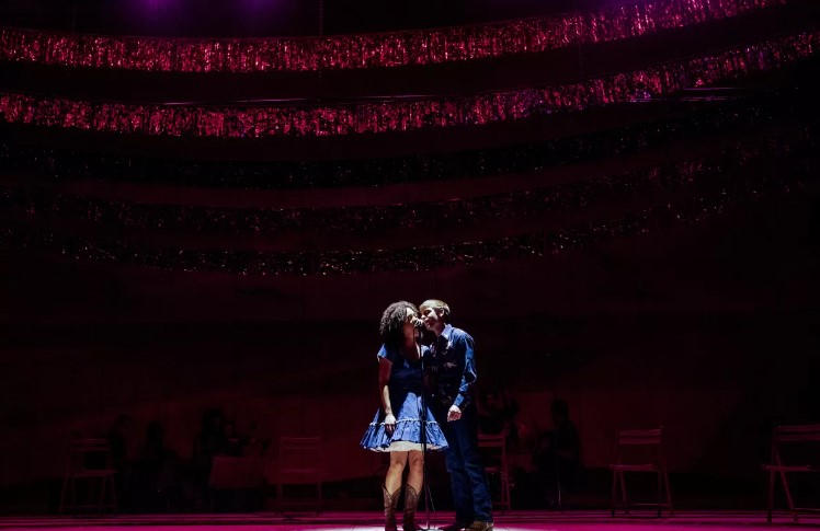 If you love the music of the musical, don’t worry, no lyrics or songs have been removed, but the score feels gloomier and feels more mourning than anything else. The whole cast is brilliant but a few cast members stand out more than others. Sasha Hutchings, who stars as Laurey shows her character that understands the wrongs better than the rights and gives an interpretation of the role that is enduring, daring, fearless, and a survivor. At the end of the show, you question her interpretation of the character because of her doings. Breaking the norms, the character Ado Annie is performed freely by Sis, a Black transgender performer whose energy fills the room and brings the sun out when things are too gloomy in Oklahoma.